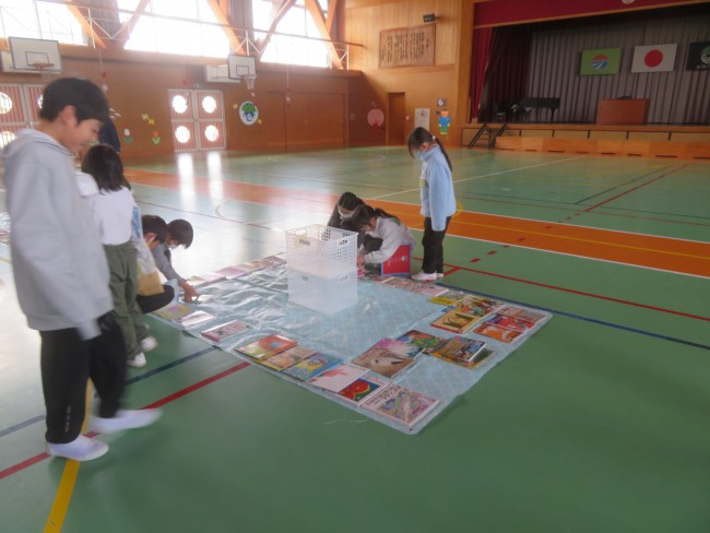 子供たちは先を争うように体育館へ行って借りたい本を探していました。