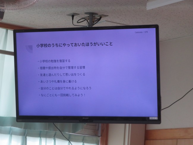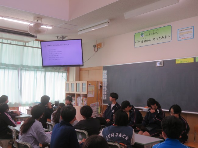 今日は、6年生に向けて中学校生活についてのプレゼンテーションをしてくれました。
