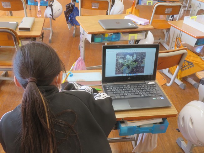 大きくなったはっぱを見ながらクロムブックで写真を撮って、観察カードに記入するのもとてもうれしそうです。