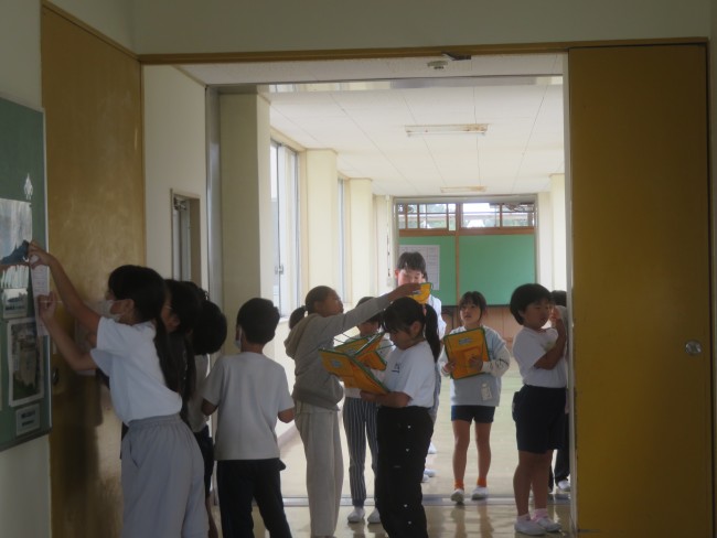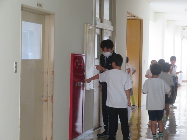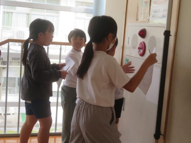 3年 防火設備をさがそう 2025/11/07 3年生が社会の学習で校内の防火設備を見つける学習をしました。 校内のいろいろなところに設置されている煙探知機、消火器、防火扉など「ここにもあった」と言いながら、真剣にさがしていました。