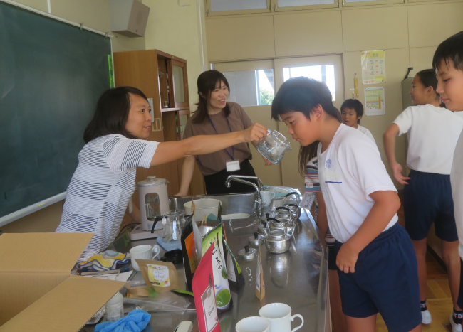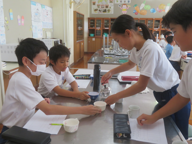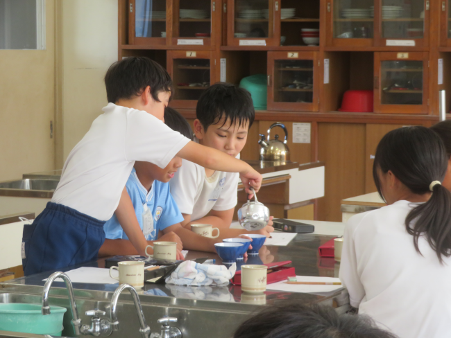 5年生 はばたき 2025/10/02 5年生がはばたきの学習でいろいろなお茶の飲み比べを行いました。 保護者の方の御協力をいただき、お茶屋さんで扱っているいろいろな種類のお茶を試飲しました。 子供たちは、お茶によって色や香りも違って驚いていました。 飲み比べたお茶は、子供たちが考えているはばたきの計画の中で使いたいようです。 どんなお茶を選んで、どんな学習になるか楽しみですね。