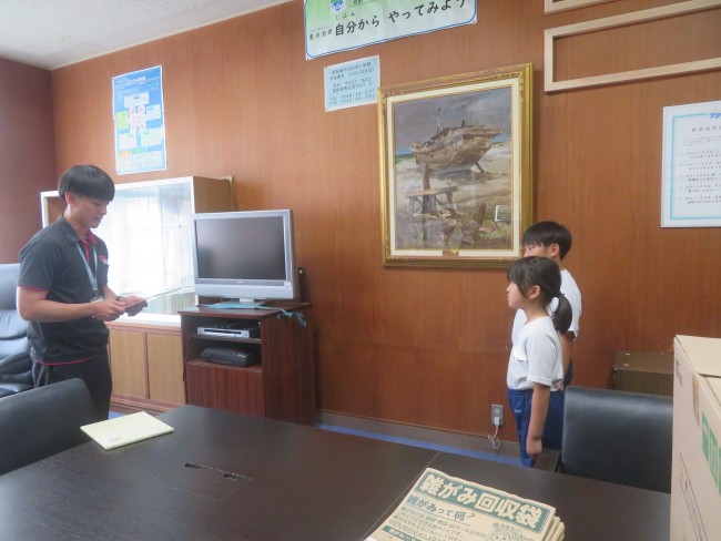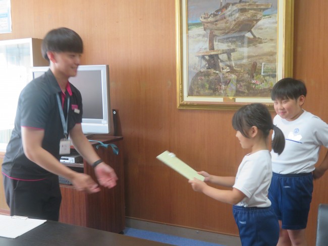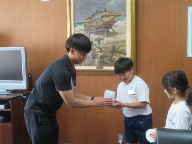 DX推進課さんから、お礼をいただきました 2025/10/09 4年生が取り組んだ雑紙回収のお礼をDX推進課の方からいただきました。 4年生が社会の学習の一環で集めた雑紙を集め、トイレットペーパーと環境について学ぶ書籍をいただきました。 代表の子が雑紙を集めた感想とお礼を伝えました。